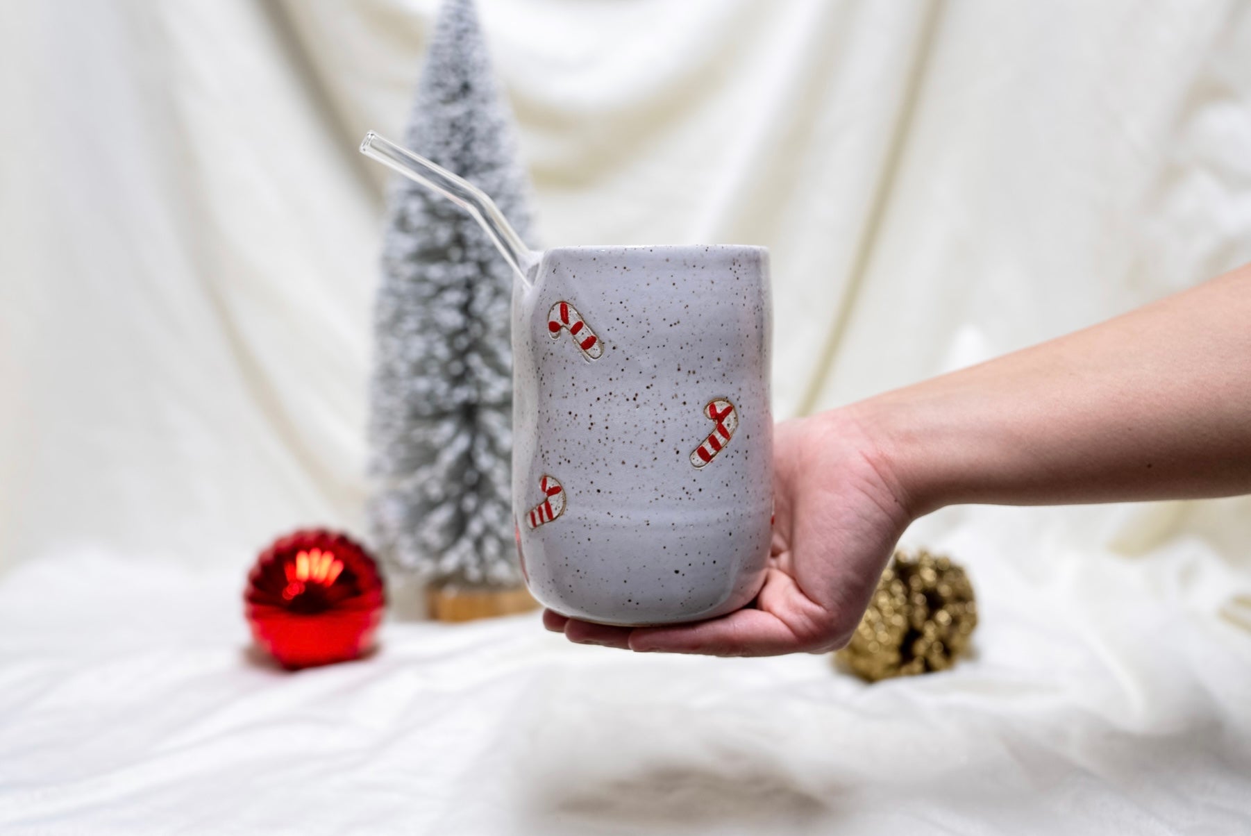 Sip your favorite holiday drinks with a dash of nostalgia using the Candy Cane Lane Straw Cup. Handcrafted in a soft speckled white glaze, this festive piece features tiny red-and-white candy canes carved and painted by hand — bringing a cheerful touch to every sip. The reusable glass straw adds a clean, modern contrast to its cozy holiday charm.