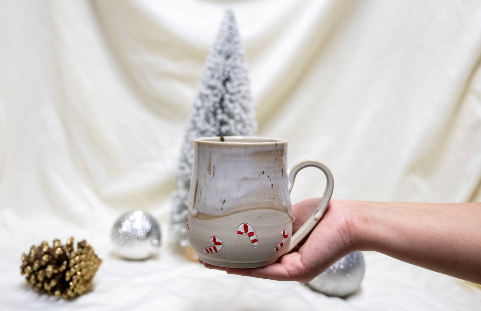 A cozy favorite for the holiday season — each mug is wheel-thrown, hand-carved, and detailed with miniature candy canes for a playful yet timeless touch.