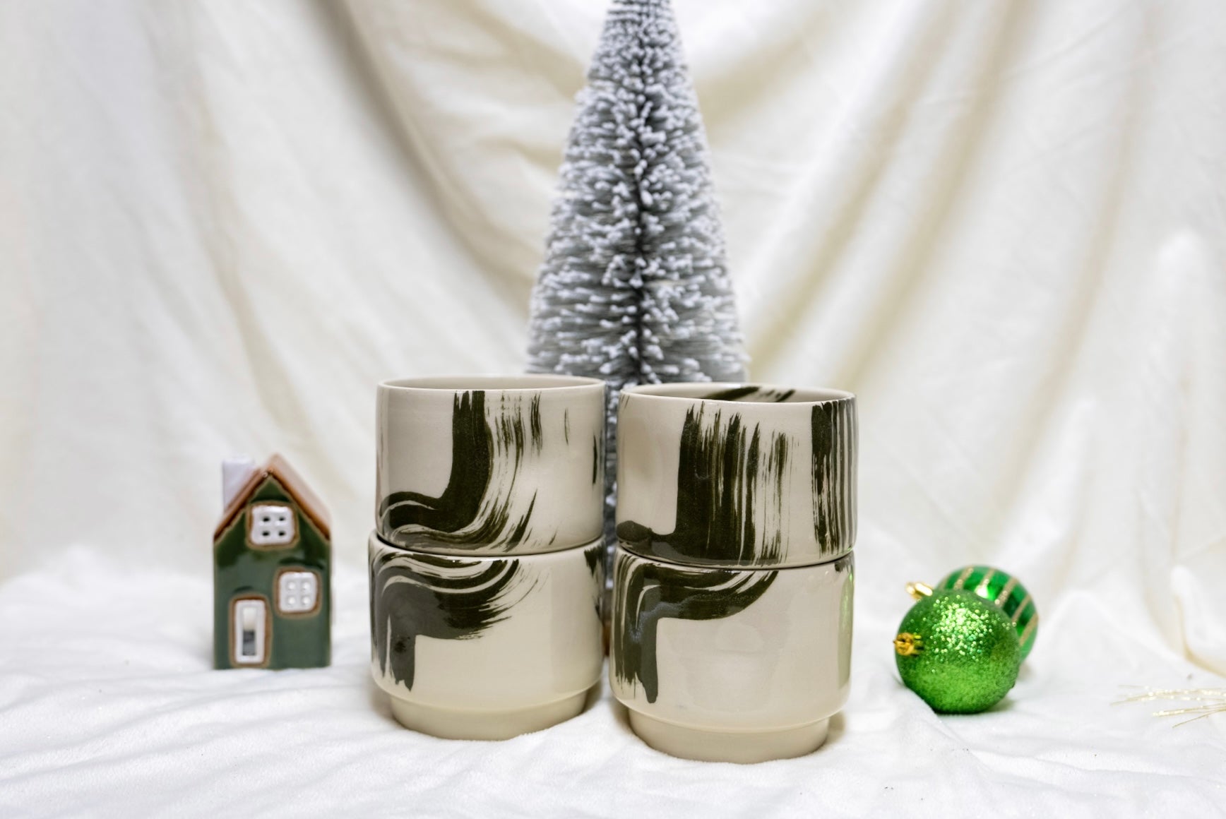 Modern, minimal, and made to fit seamlessly into your daily routine — the Evergreen Brushstroke Cup Set features two hand-thrown cups finished in a soft ivory glaze with deep green brushstrokes that flow organically across the surface. Each stroke is painted by hand, creating a unique rhythm and texture that makes every set one-of-a-kind.