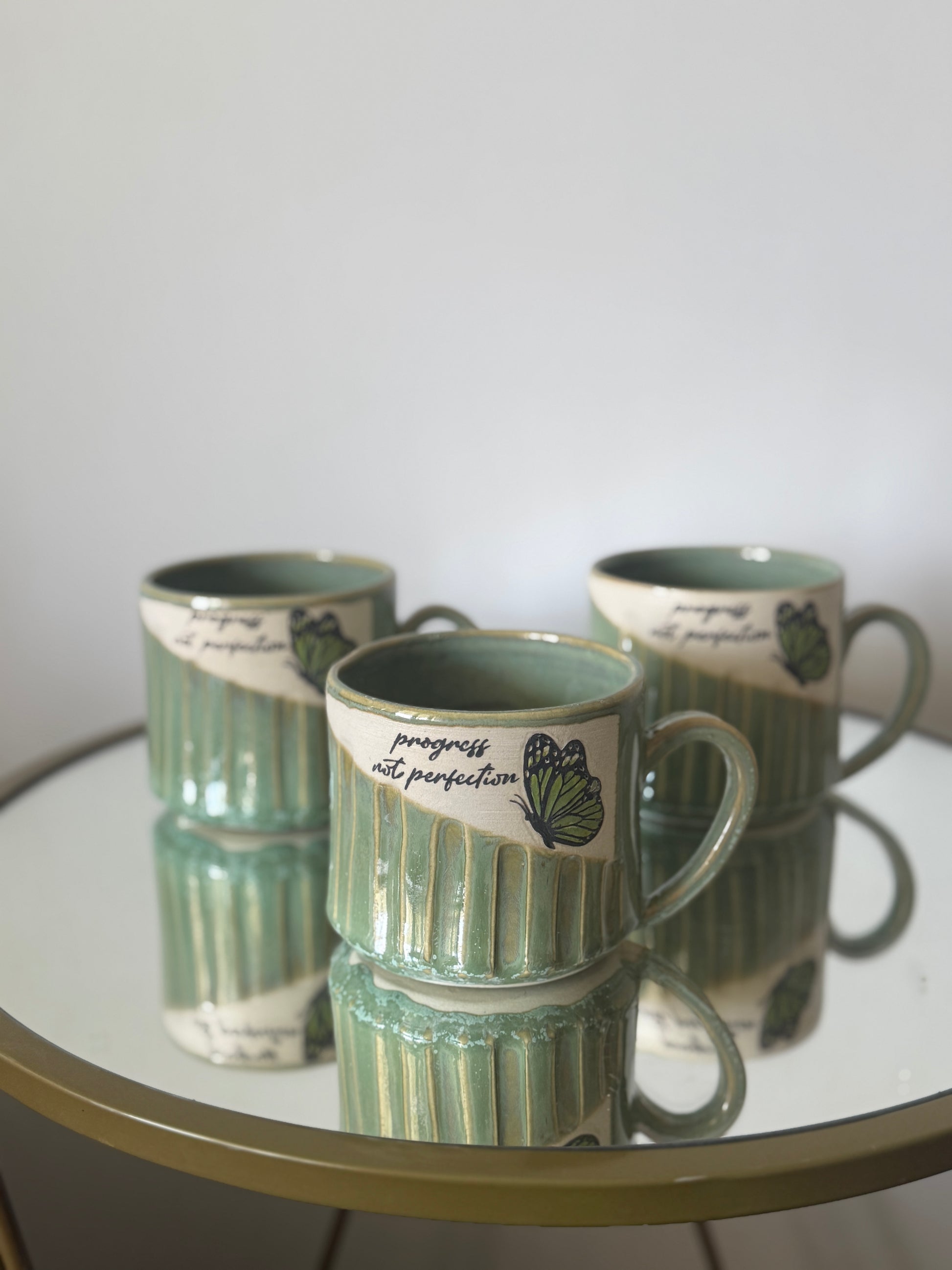 On the front, a gentle green butterfly is under glazed alongside the words “progress not perfection” — a grounding reminder that growth doesn’t have to be linear or flawless to be meaningful.